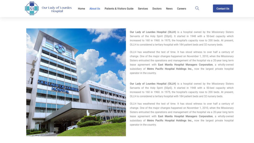 Our Lady of Lourdes Hospital is owned by the Missionary Sisters Servants of the Holy Spirit (SSpS). OLLH has been serving the healthcare needs of people for over 70 years managed by the East Manila Hospital Managers Corporation